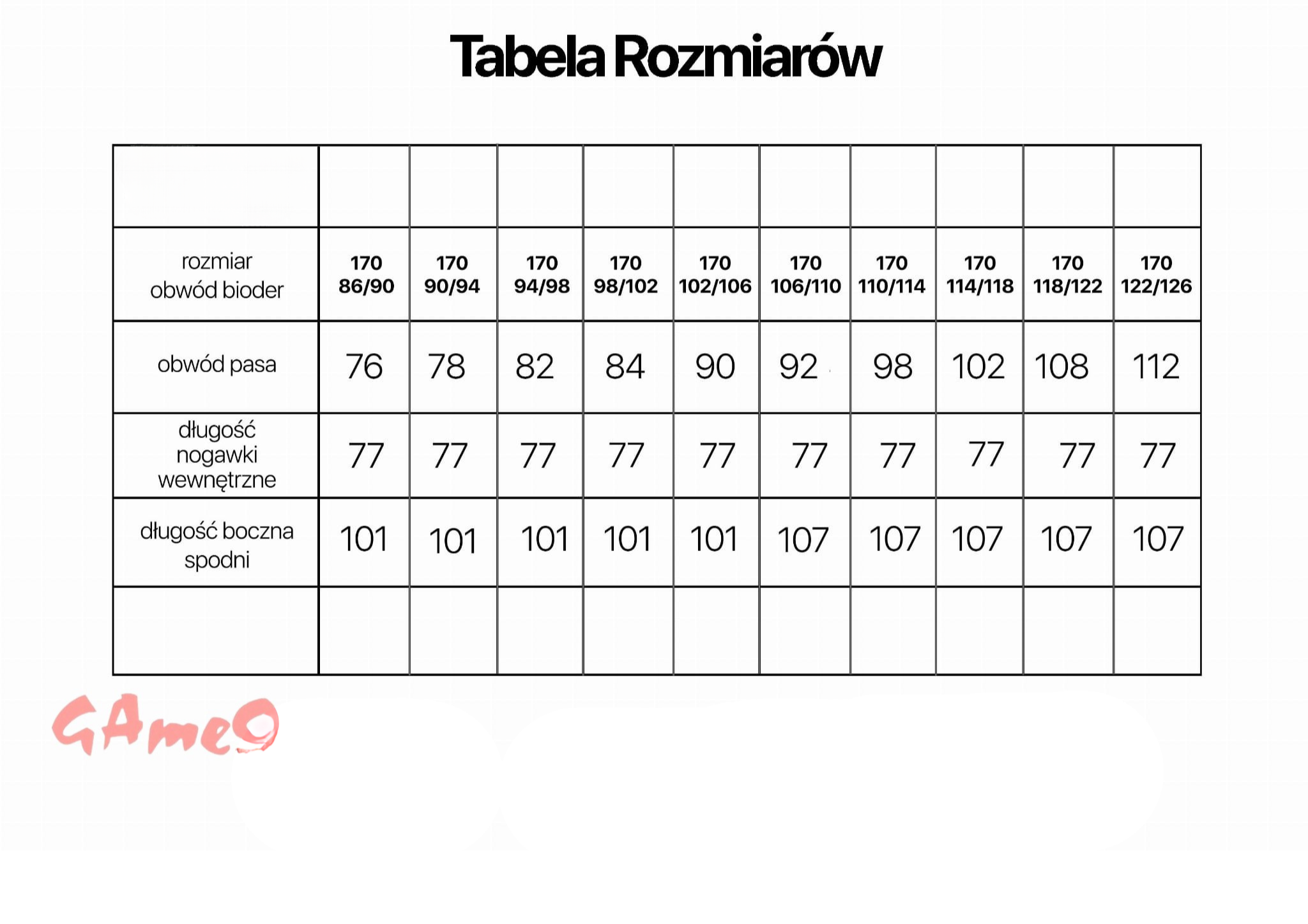 D: długość zewnętrzna - zmierz wzdłuż bioder, od talii, do końca
