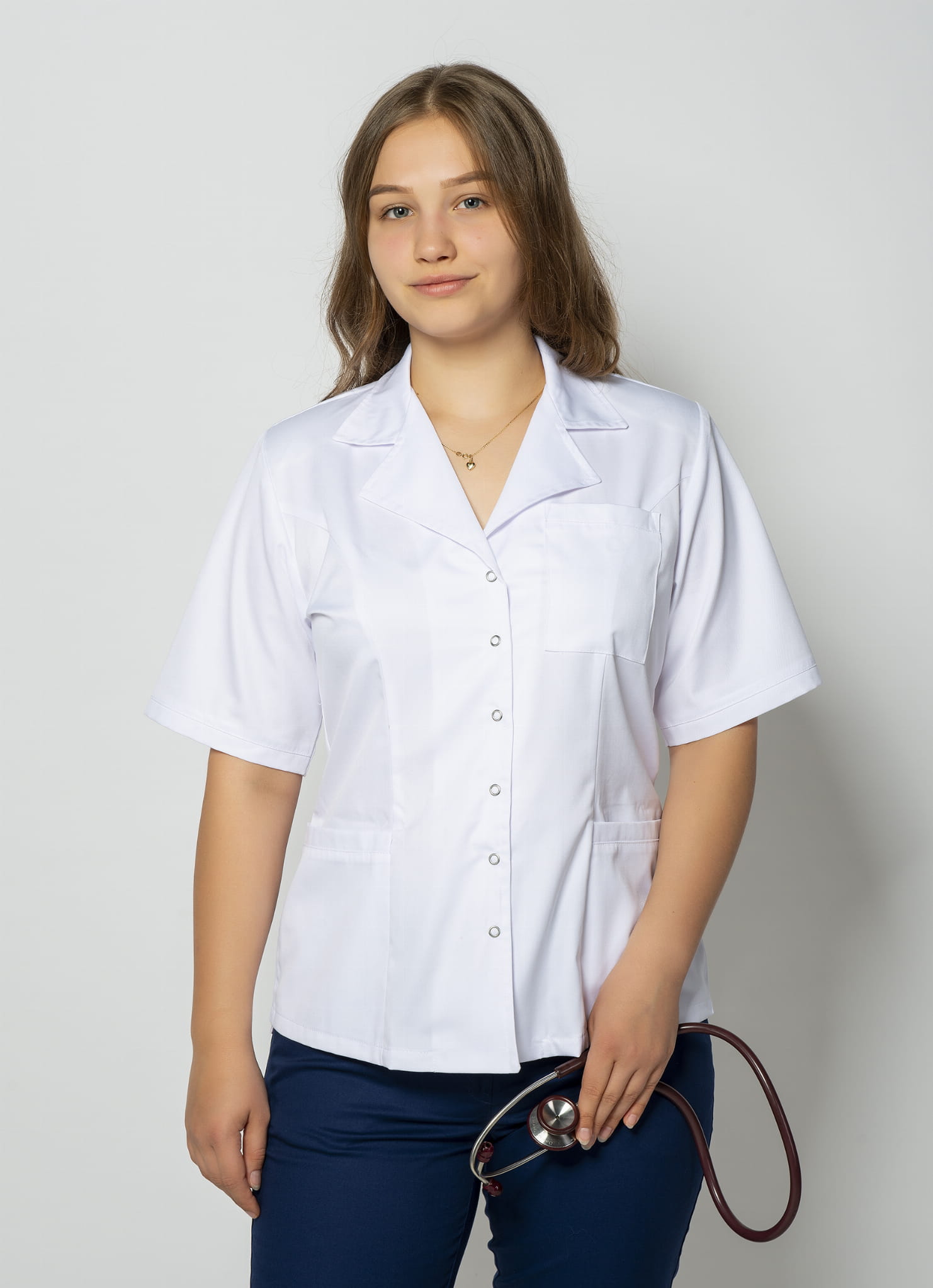 Games damska bluza medyczna Karolina, krótki rękaw, zapinana na napy, ozdobny kołnierz, dopasowany krój, promocja