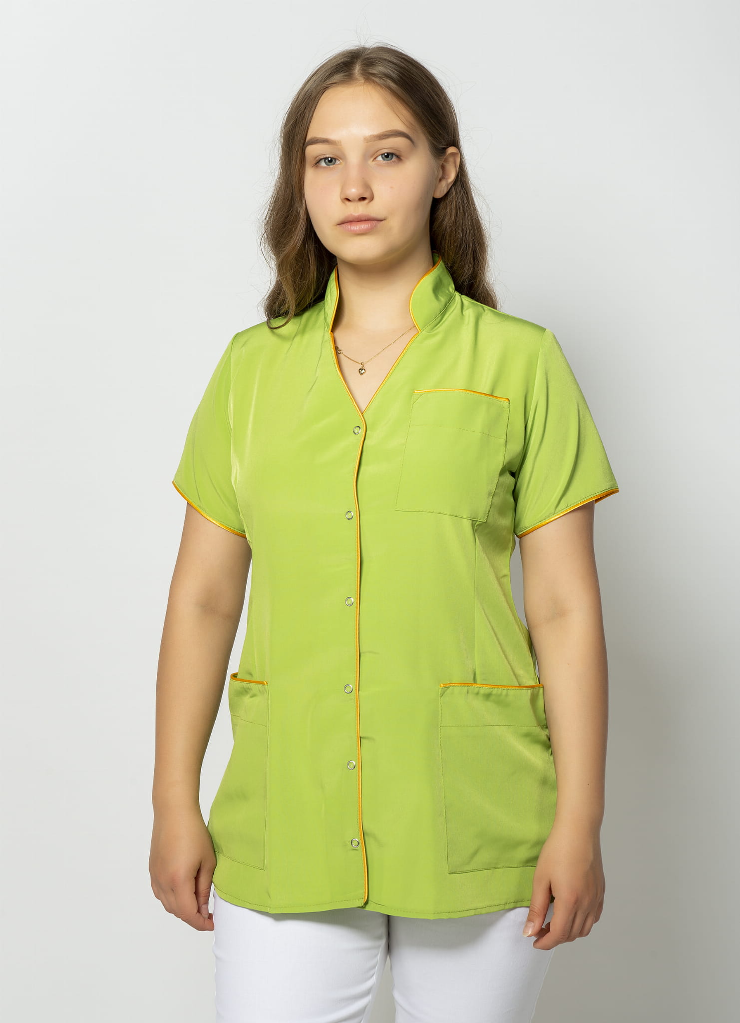 Games damski fartuch spożywczy, gastronomiczny Żaneta, krótki rękaw, zapinana na napy, dopasowany do sylwetki, ozdobny dekolt i lamówka, materiał odporny na plamy, promocja
