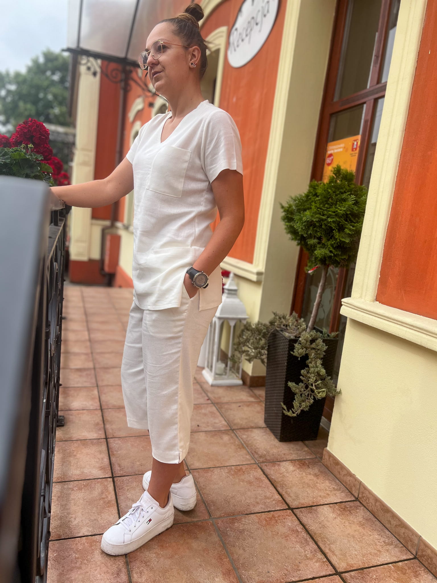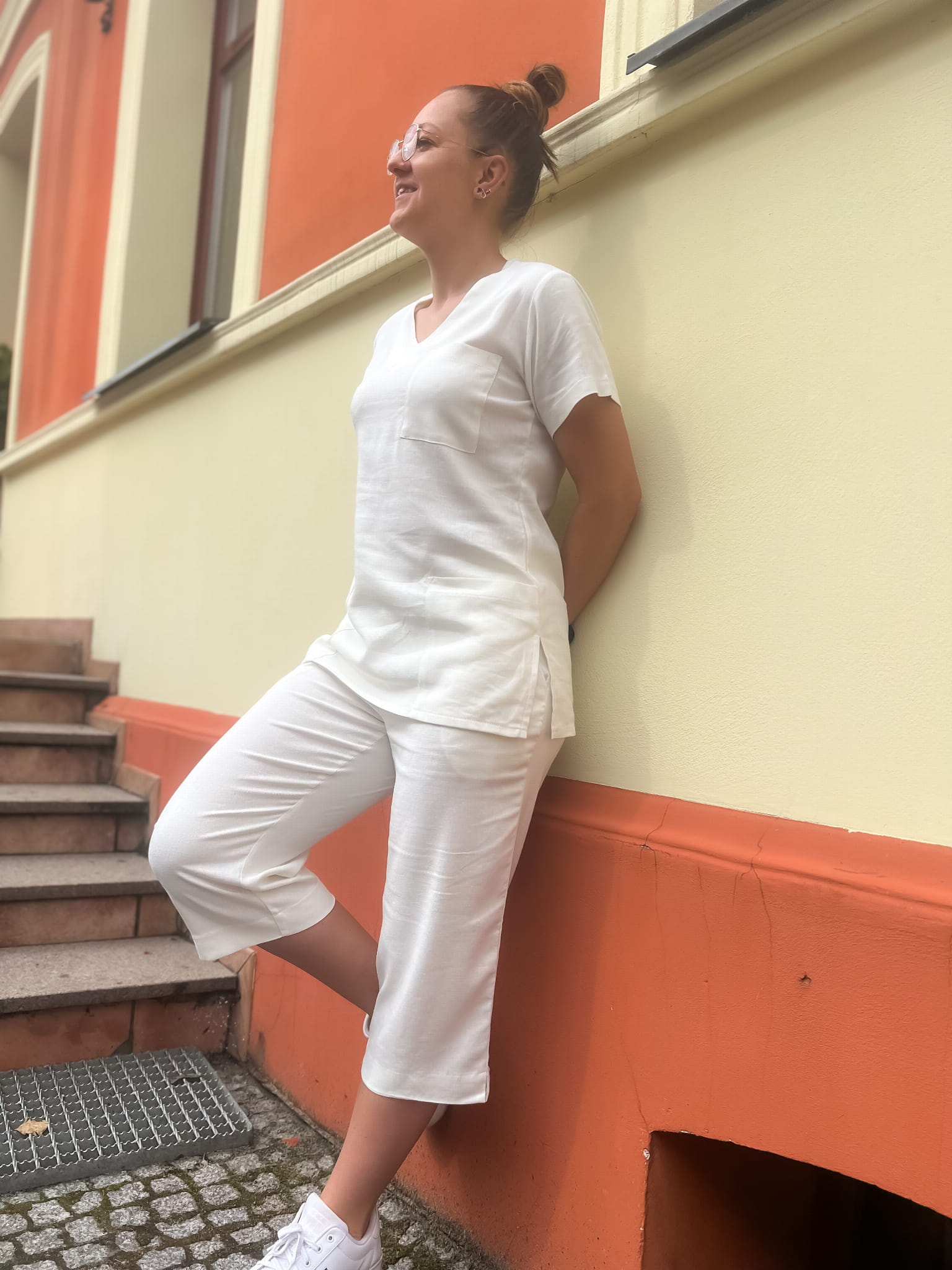 Games damski komplet medyczny, lniany, rybaczki i bluza, kolor kremowy